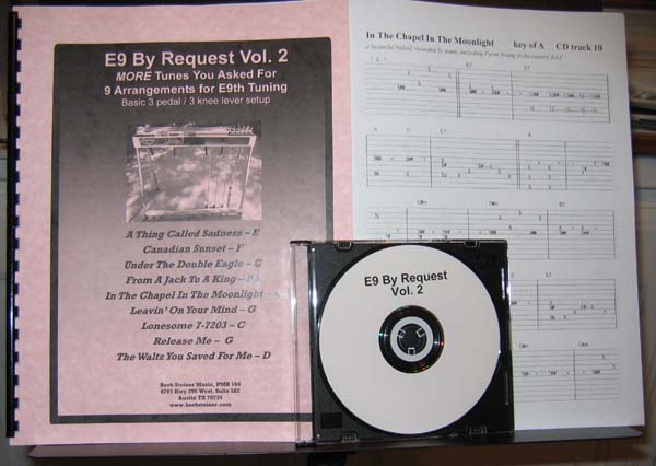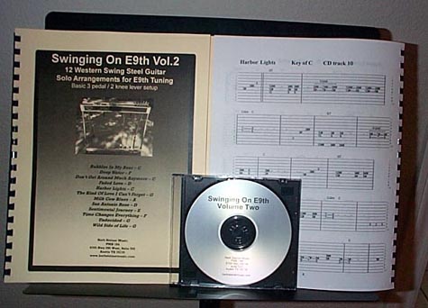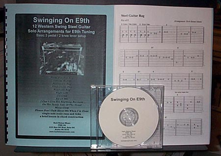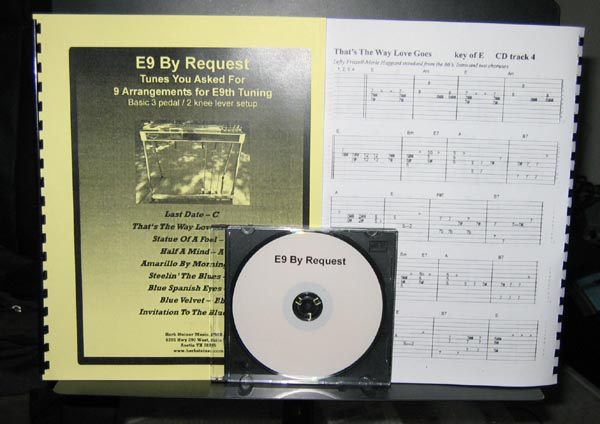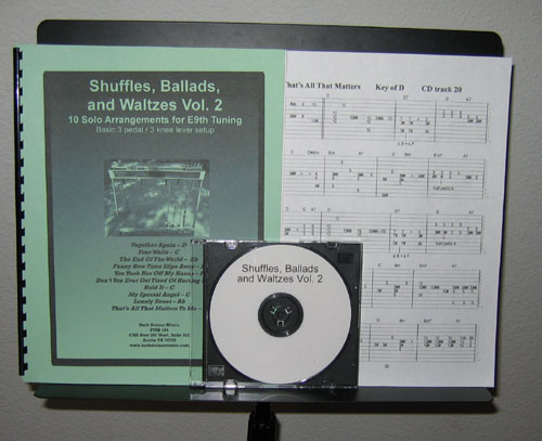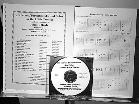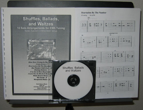 The pedal setup required is a regular E9th tuning with 3 pedals and 3 knee levers (E lowers, E raises, and D# lower), that are the basic levers in any E9th tuning There are 3 "Texas shuffles" in the Ray Price/Johnny Bush style, 5 ballads in slower tempos, and 2 waltzes that everyone in country music has had to play dozens of times in their bandstand work. I've tried to stay pretty traditional to the melodies of these tunes, what I call the "Jimmy Day" approach. Some of the ballads are reminiscent of Jimmy's Steel And Strings album. The shuffles are played like you'd have to play them on a Texas dancehall bandstand. The arrangements contain lots of licks, intros, turnarounds, etc. that can be applied to any number of country songs. The tab book is 24 pages in length, the CD about 40 minutes long. |